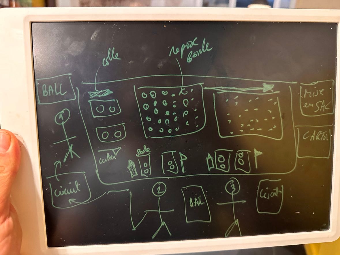 10 minutes d'assemblage par kit en début de journée, 3min15 à la fin du week-end : un vrai atelier de production.